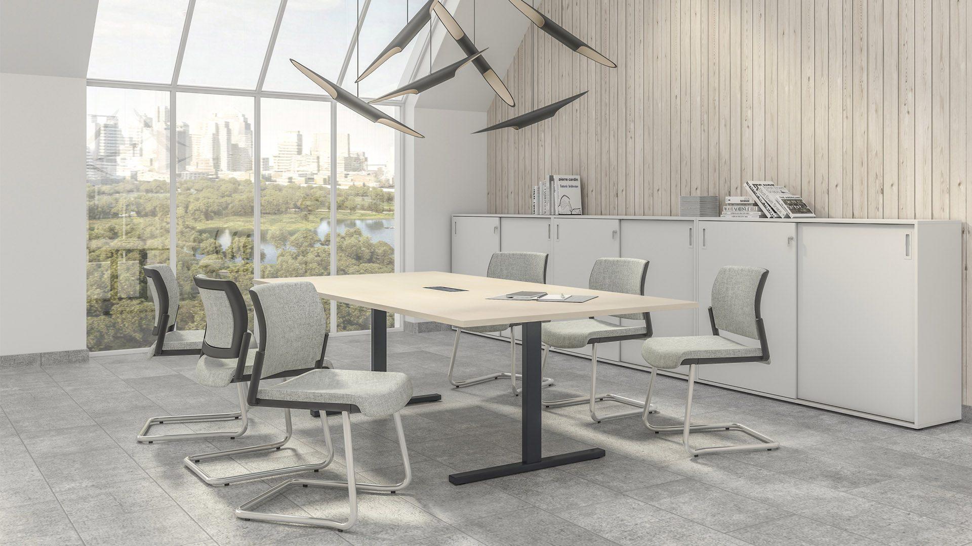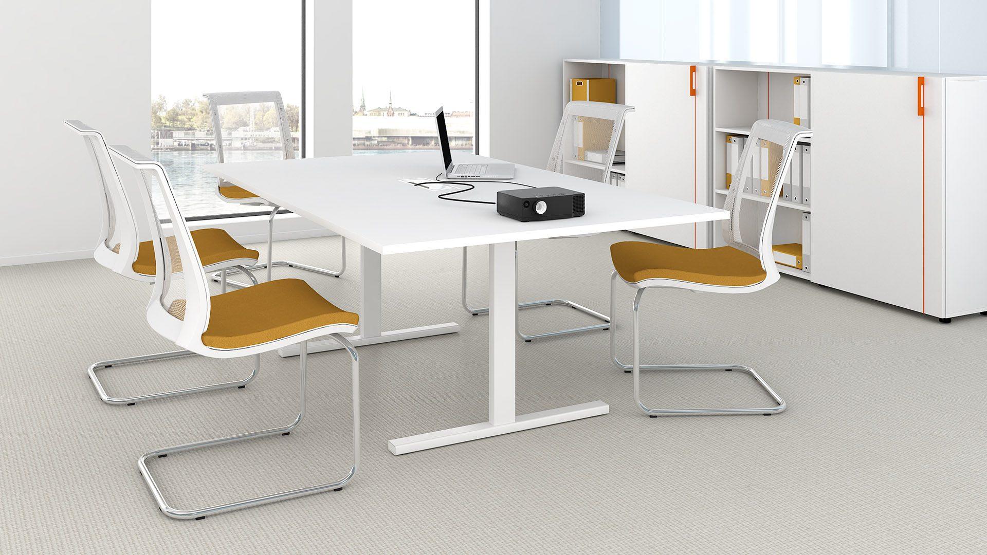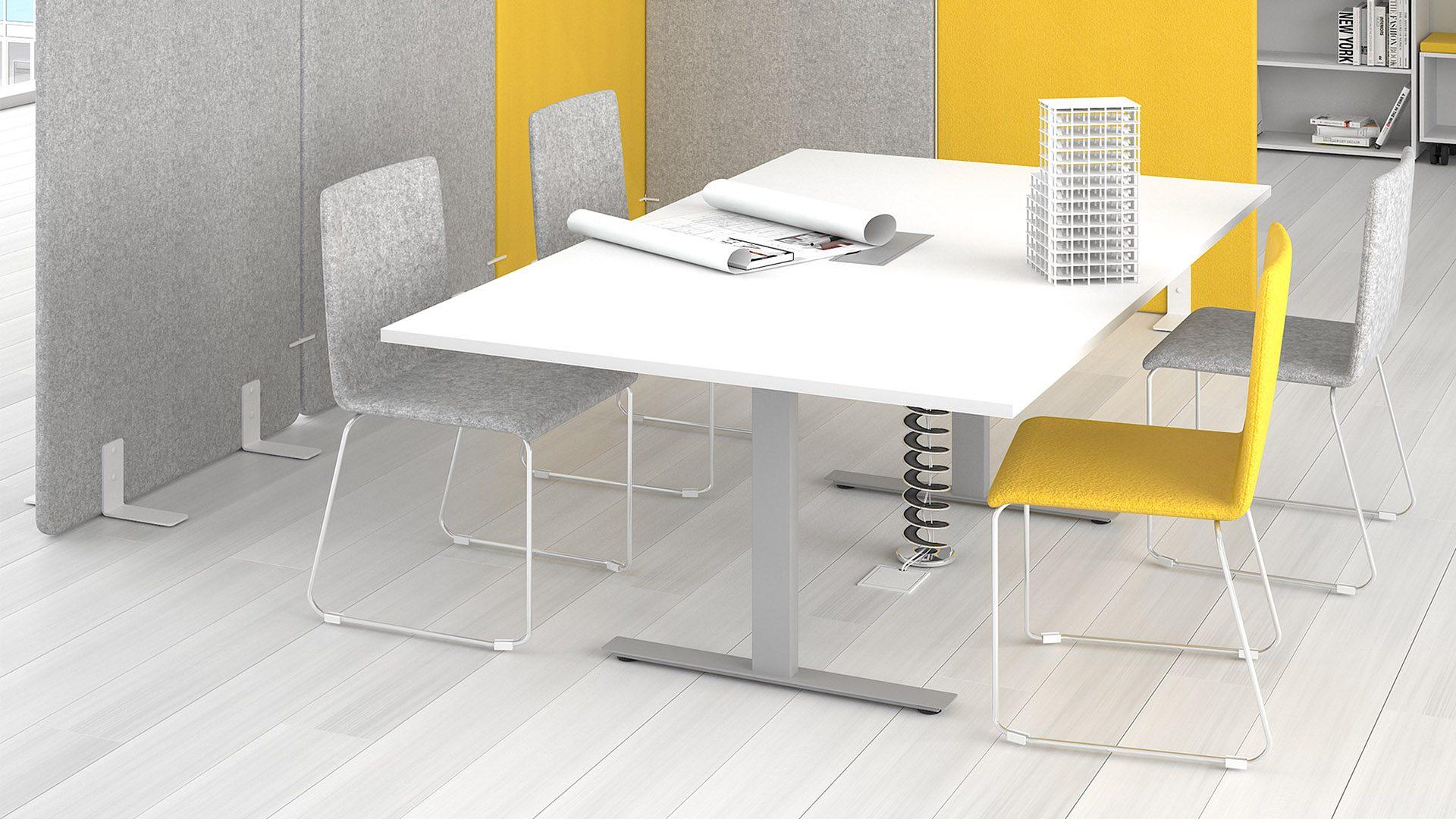 Konferenčné stolíky T-EASY sa skvele hodia k stolom s pevnou výškou z rovnakého systému a elektrickým výškovo nastaviteľným stolom EASY.